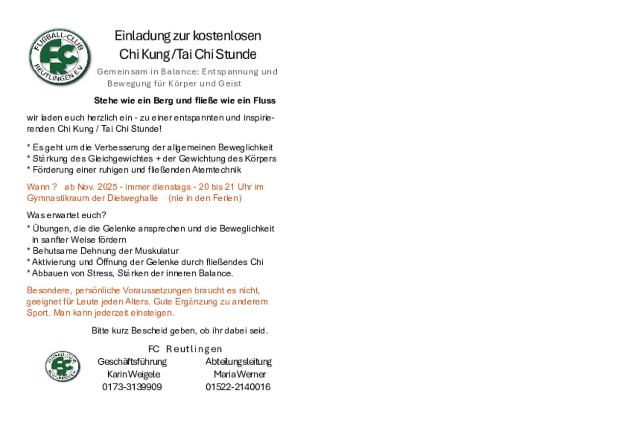 Kommen sie unverbindich zu einer kostenlosen Stunde. Dienstags 20 - 21 Uhr in der kleinen Carl-Diem-Halle